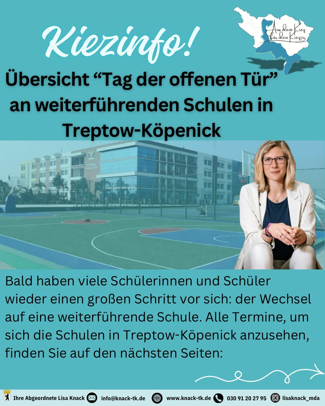#tagderoffenentür Bald ist es wieder soweit und Schülerinnen und Schüler aus Treptow-Köpenick wechseln auf eine weiterführende Schule. Es ist eine aufregende Zeit, welche meist auch mit vielen Fragen zu den Angeboten an den zukünftigen Schulen einhergehen. Eltern und ihre Kinder haben in den nächsten Wochen wieder die Möglichkeit zu dem jeweiligen "Tag der offenen Tür (TdoT)" zu gehen. Im Beitrag findet ihr die TdoT der Schulen aus Treptow-Köpenick mit ihren jeweiligen Terminen :) #ausdemkiezfürdenkiez #lisaknack #kiezinfo #schule #schulwechsel #treptowköpenick