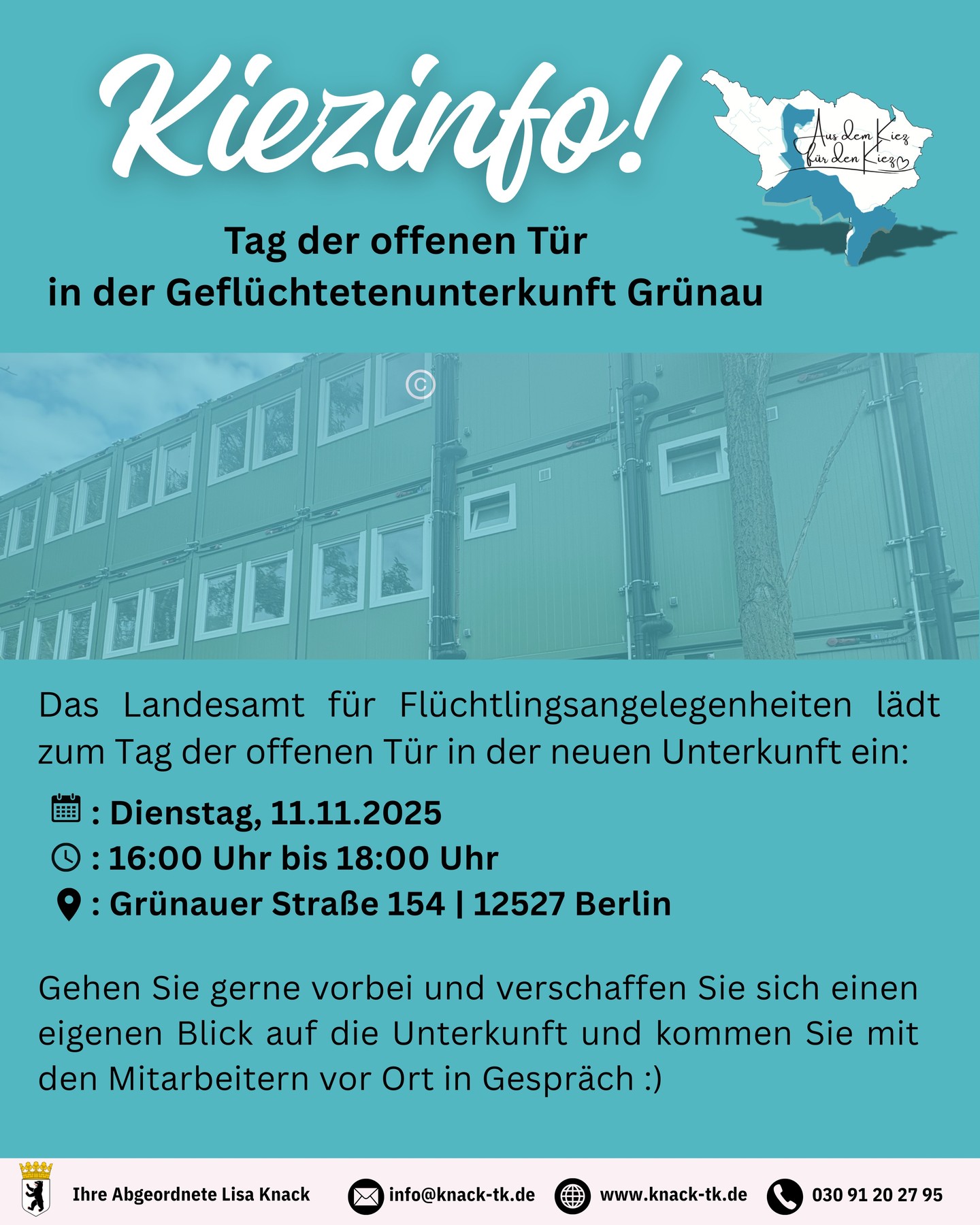 mehr#kiezinfo Ein Thema, welches im Sommer an mich herangetragen wurde, war die neue Geflüchtetenunterkunft in der Grünauer Straße. Nach Gesprächen vor Ort und mit dem Landesamt für Geflüchtete war schnell klar, dass es einen Tag der offenen Tür geben wird. Nächste Woche soll dieser nun stattfinden. Nutzen Sie gerne die Möglichkeit sich selbst ein Bild vor Ort zu machen und mit den Mitarbeiterinnen und Mitarbeiter ins Gespräch zu gehen. Sicherlich können im direkten Austausch dringende Fragen geklärt werden. Sollten Sie zu dem Thema Gesprächsbedarf haben, können Sie sich gerne an mich wenden. Schreiben Sie mir an info@knack-tk.de #ausdemkiezfürdenkiez #lisaknack #grünau