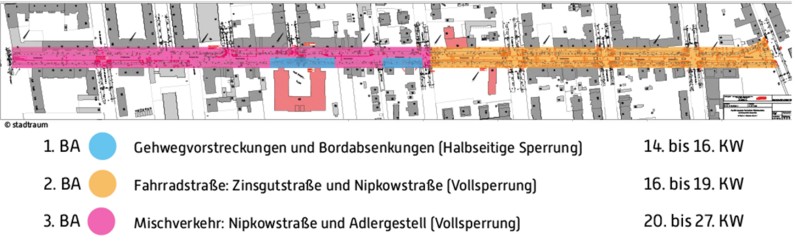 Als zweiter Bauabschnitt folgt bis Anfang Mai die Umsetzung der ausgewiesenen Fahrradstraße. Der Bereich zwischen Zinsgutstraße und Nipkowstraße wird währenddessen voll gesperrt.