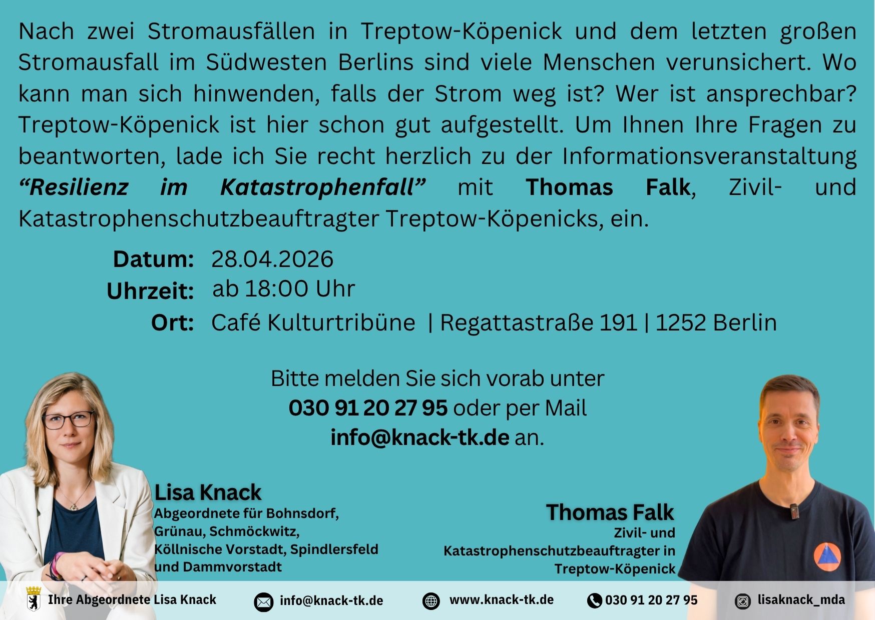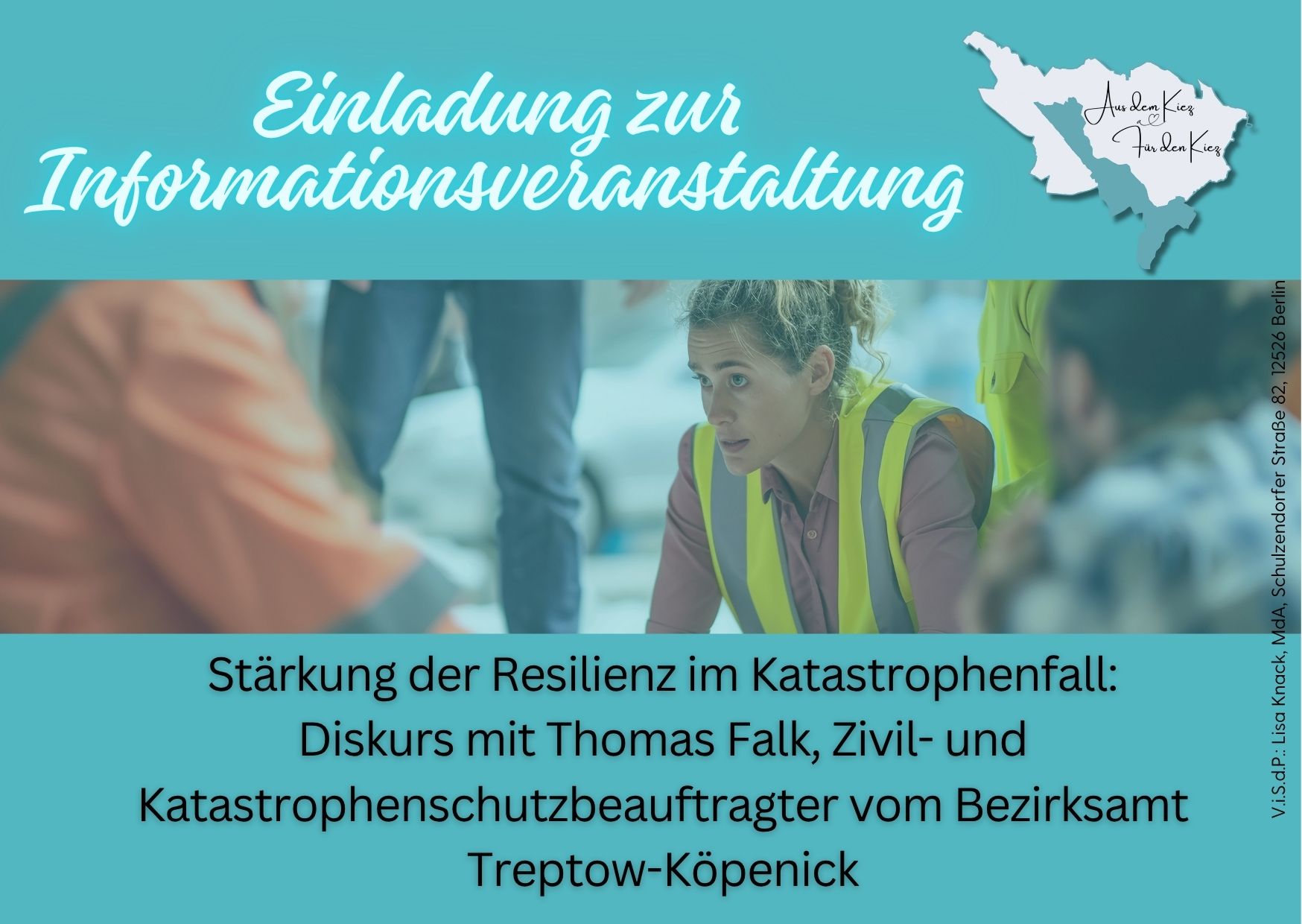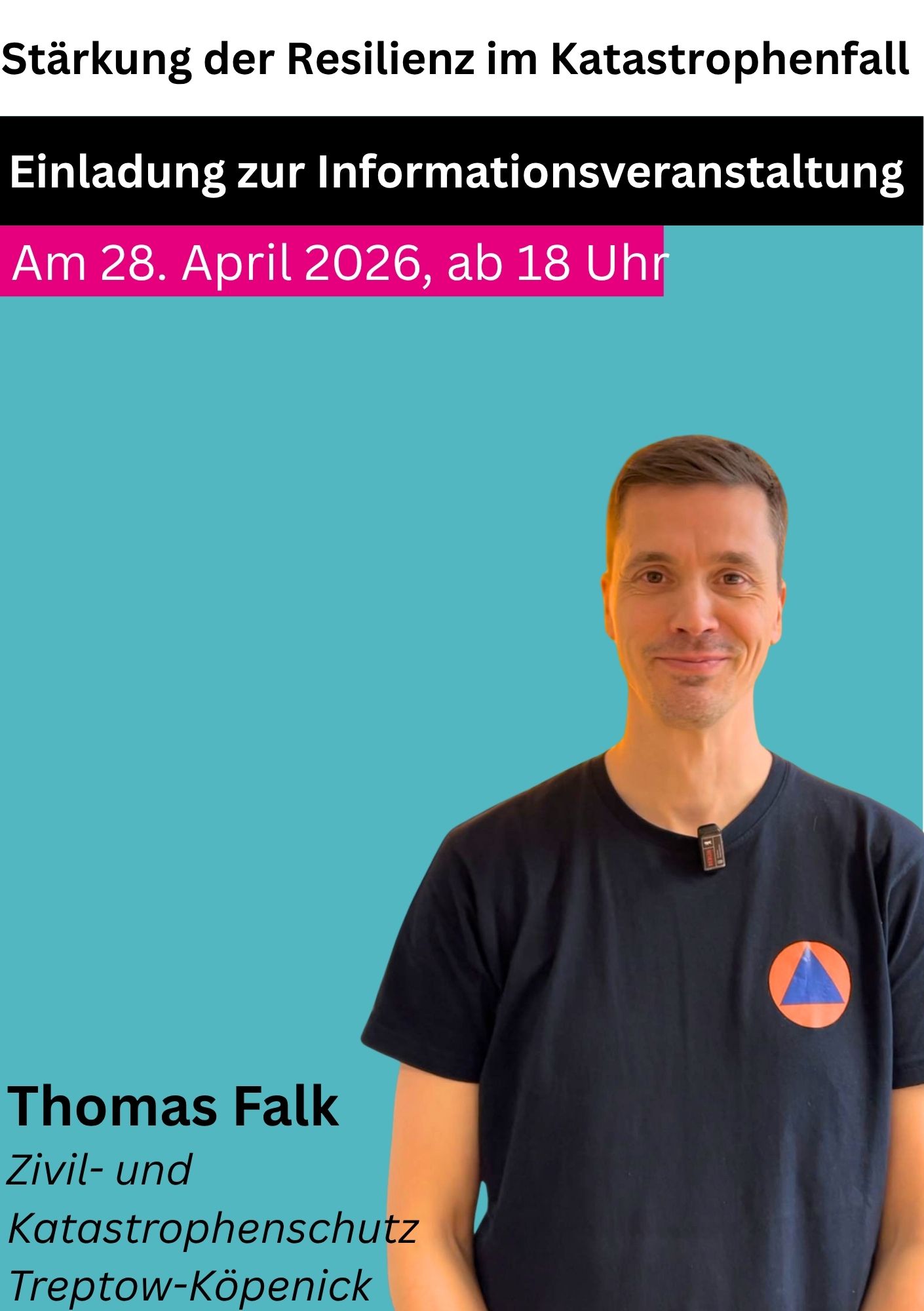 Treptow-Köpenick ist hier schon gut aufgestellt. Um Ihnen Ihre Fragen zu beantworten, lade ich Sie recht herzlich zur zweiten Informationsveranstaltung “Resilienz im Katastrophenfall” mit Thomas Falk, Zivil- und Katastrophenschutzbeauftragter vom Bezirksamt Treptow-Köpenick, ein.