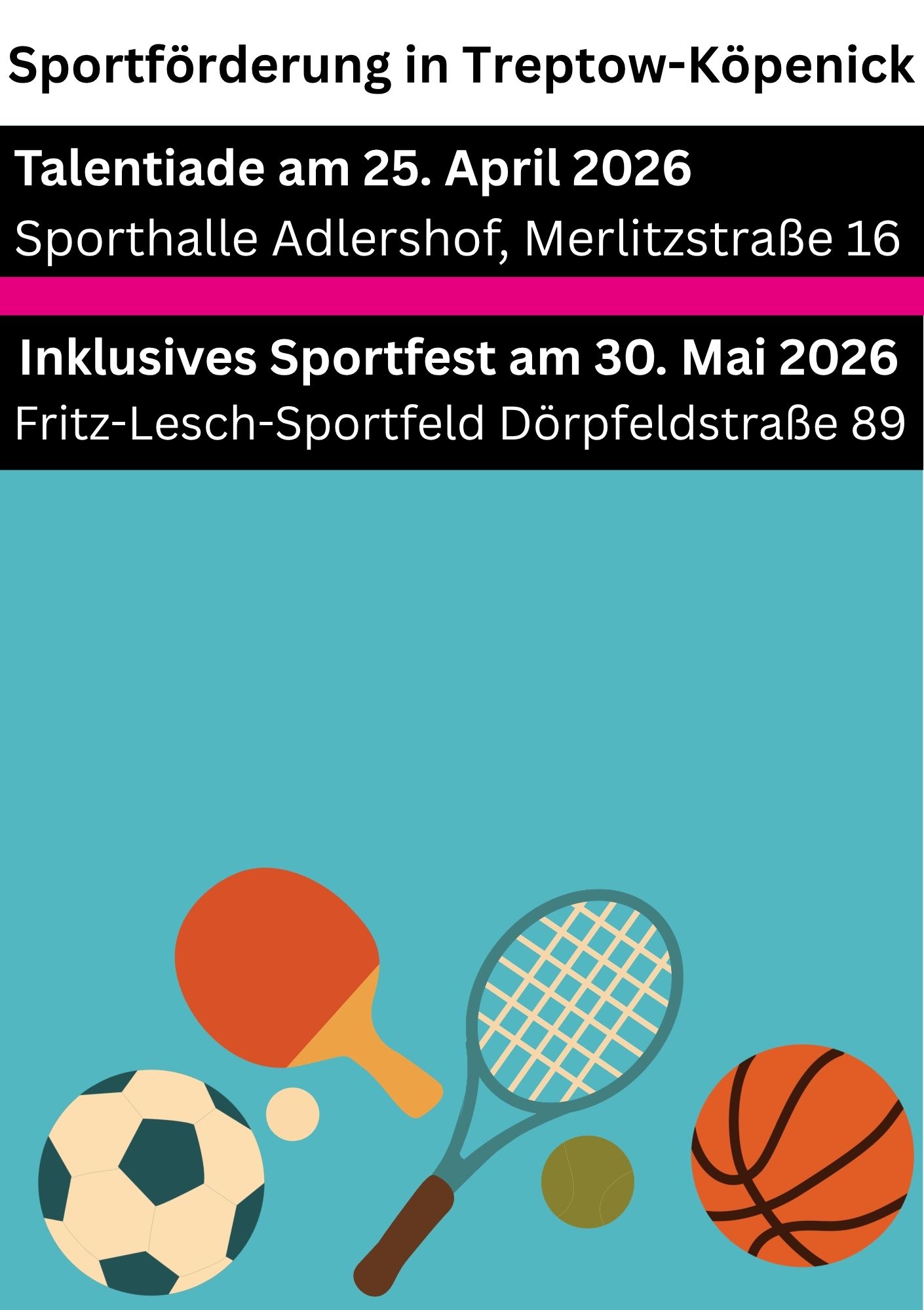 Am 25. April 2026 findet die bezirkliche „Talentiade“, in der Sporthalle Adlershof, in Merlitzstraße 16, statt. Nach der Auswertung des Deutschen Motorik-Tests (DMT) wartet auf sportlich begabte Kinder ein besonderes Highlight: die persönliche Einladung zu einer der Berliner Talentiaden. Unter dem motivierenden Motto „Leistung macht Spaß“ bieten diese Sportfeste eine einzigartige Plattform, um die Vielfalt der Berliner Sportwelt an nur einem Tag zu entdecken.
