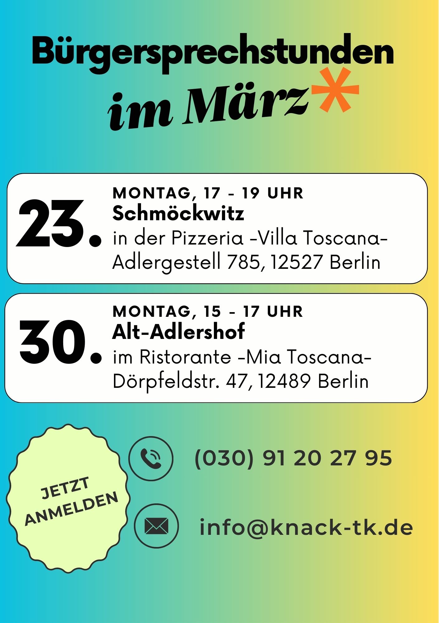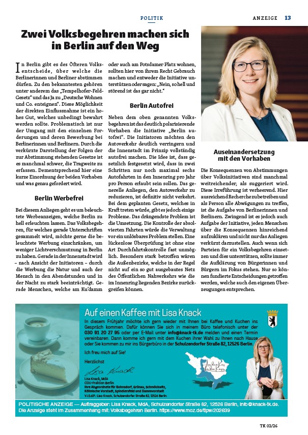 In diesem Bereich finden Sie Informationen aus der Politik, welche sich um Schmöckwitz drehen. Gefühlt wird Schmöckwitz bei vielen wichtigen Projekten in Treptow-Köpenick nicht mitgedacht. Wenn Sie also Anliegen oder Themen haben, nehmen Sie gerne mit mir Kontakt auf!